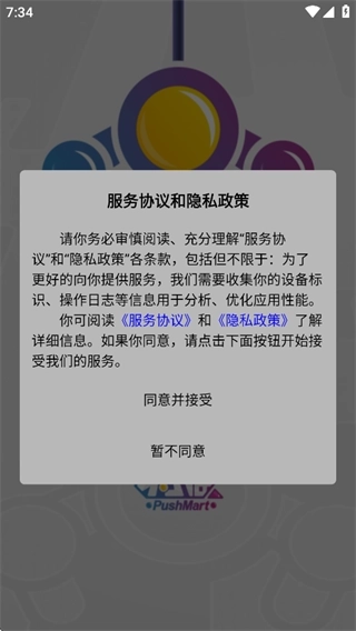 1、打开后,仔细阅读服务协议与隐私政策,随后点击同意并接受;