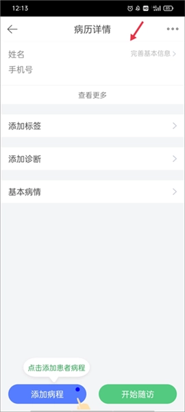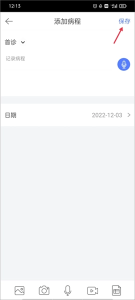 (3)接着添加病程记录,也就是把首诊期间的整个过程都记录下来,填写完成后点击右上角的“保存”按钮。