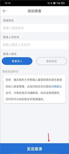 这时候点击“开始随访”,填写患者的姓名与联系方式,然后发送邀请。