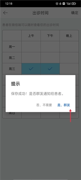 这时页面会弹出一个询问是否给患者群发通知的提示,点击“是,群发”按钮即可。